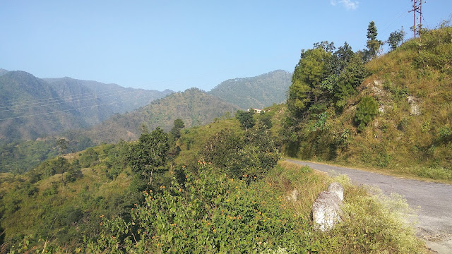 नीलेश्वर महादेव के दर्शन करके मैं आगे कोटद्वार के ओर निकल लिया। चिडियापुर उत्तराखंड - यूपी बोर्डर से थोडा पहले एक रास्ता पूर्वी गंग नहर के साथ- साथ जाता है, इस रास्ते से कोटद्वार जाने वालों को नजीबाबाद जाने की जरुरत नही पडती। शुरु में रास्ता काफी टूटा हुआ है लेकिन 5-7 किमी के बाद अच्छा बना हुआ है। आराम से साढे बारह बजे तक कोटद्वार पहुंच गया। ठीकठाक भीड वाला कस्बा है कोटद्वार। यहाँ सिर्फ स्कूटी के टंकी फुल करायी और आगे के लिए निकल लिया। कोटद्वार में हाँलाकि सुप्रसिद्ध सिद्धबली मंदिर है, लेकिन इसे कल वापसी के दौरान देखने के लिए छोड दिया। चुंकि घर से बिना खाना खाये ही चला था इसलिए अब भूख लगनी शुरु हो गई थी। करीब 10 किमी चलने के बाद एक ढाबे पर खाना खाया तो पेट को शांति मिली। यहाँ से थोडी देर बाद दुगड्डा पहुंचा। यहाँ से एक रास्ता पता नही कहाँ - 2 और अंत में नीलकंठ महादेव होते हुए ऋषिकेश के लिए जाता है। यहाँ से नीलकंठ महादेव 92 किमी दूर है। ये रास्ता भी बहुत कम लोगों का देखा हुआ है। वापसी के समय देखुंगा अगर इस रास्ते से जा पाया तो! दुगड्डा से थोडा आगे से एक रास्ता गुमखाल होते हुए पौडी जाता है जबकि दूसरा रास्ता लैंसडोन,जहरियाखाल होते हुए गुमखाल और आगे पौडी जाता है। मैं लैंसडोन वाले रास्ते पर हो लिया। थोडा चलते ही चढाई शुरु हो गयी और साथ ही चीड का जंगल भी आ गया। चीड का जंगल बहुत ही सुंदर लगता है और चीड के जंगल में सुंदर नजारों को अपने कैमरे में कैद करने के लिए लैंसडोन से करीब 10 किमी पहले एक जगह मैंने अपनी स्कूटी रोकी और जी भर के फोटो लिये। लैंसडोन से चार किमी पहले ही रिखणीखाल वाले रास्ते पर मुड गया। शुरु में करीब 10 - 12 किमी तक रास्ता उतराई का है। मेरे आगे एक जीप जा रही थी तो मैंने इसके पीछे पीछे ही चलने में अपनी भलाई समझी। करीब 15 किमी दूर सिसल्डी में मैंने इस जीप को पीछे छोडा। इस 15 किमी के रास्ते में मुझे विभिन्न जगहों के बारे में जानकारी देते कई बोर्ड लगे दिखाई दिये, मगर इनमेंं से किसी भी जगह का नाम मैंने आज से पहले कभी नही सुना था।